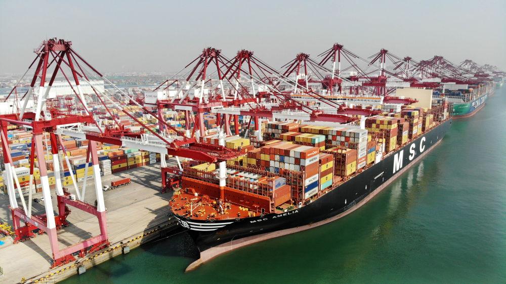 货轮在山东港口青岛港装卸集装箱(2024年3月13日摄,无人机照片)。新华社记者 李紫恒 摄