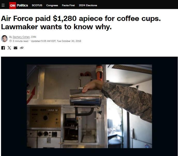 早在2018年,就有报道披露了美国空军使用的咖啡杯每个要花费1280美元,这一消息也让空军成为众矢之的。