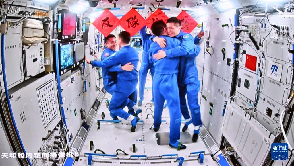这是4月26日在北京航天飞行控制中心拍摄的神舟十七号航天员乘组欢迎神舟十八号航天员乘组的画面。新华社记者 金良快 摄