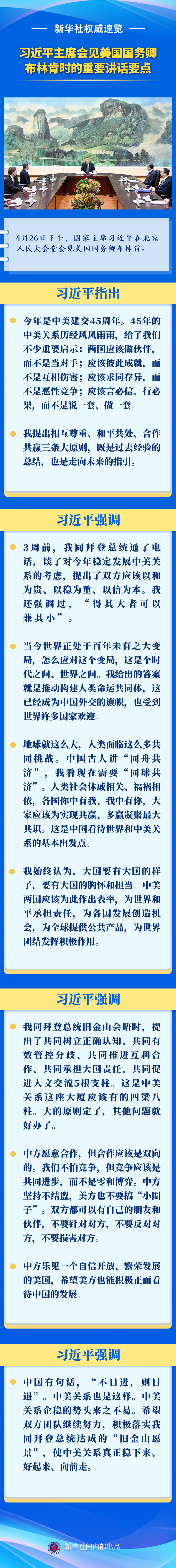 4月26日下午,国家主席习近平在北京人民大会堂会见美国国务卿布林肯。来看习近平主席的重要讲话要点。
