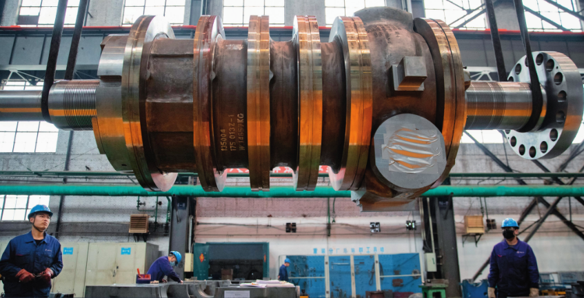 工作人员在哈电集团哈尔滨汽轮机厂有限责任公司车间内准备组装设备(2023 年 4 月 28 日摄)张涛摄 / 本刊
