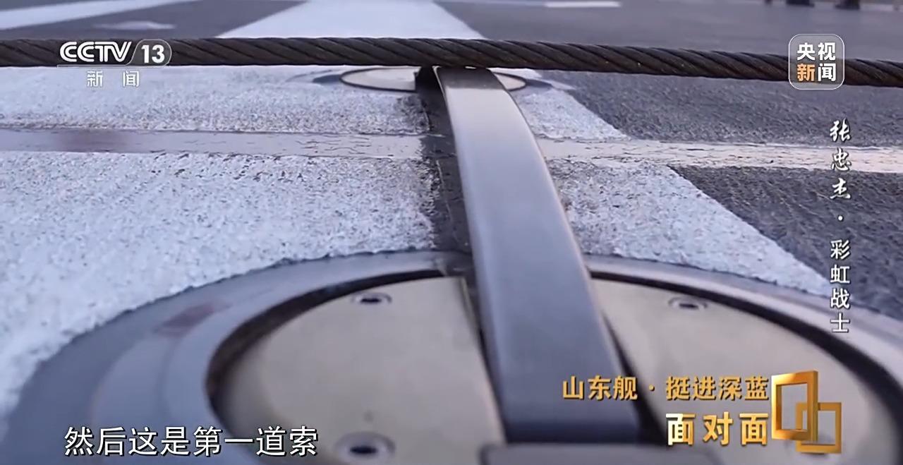 海军山东舰 张忠杰:平时就要检查它的状态是怎么样的,因为它中间这一块,有些弧度,尾钩给它钩住的时候造成的。什么时候需要更换有个标准,通过我们人员的检查来确定阻拦索的状态,如果需要更换那就更换,不需要更换就继续使用。