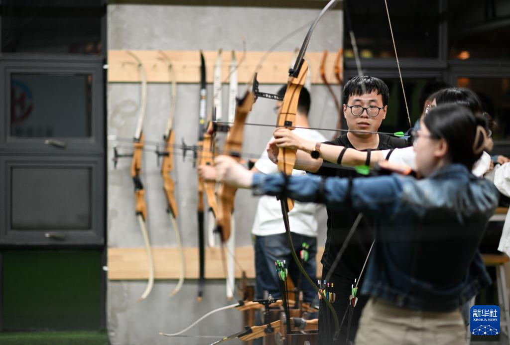 4月25日,在天津市玺元锐锋射箭俱乐部,学员在河西区青年夜校射箭课上体验射箭运动。
