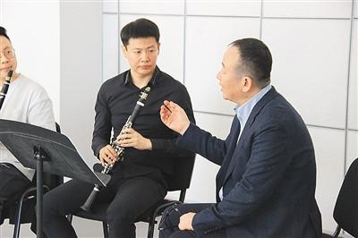中国交响乐团副团长、单簧管首席尹波(右一)指导新疆艺术学院学生。