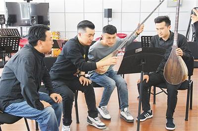 新疆艺术学院师生为中国交响乐团作曲家杨帆(左一)展示弹拨尔乐器。
