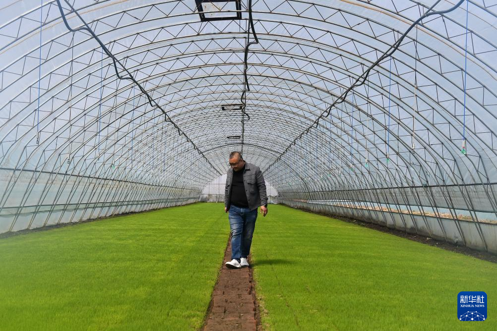 在鑫丰种植农民专业合作社,金天在查看水稻育苗情况(4月17日摄)。
