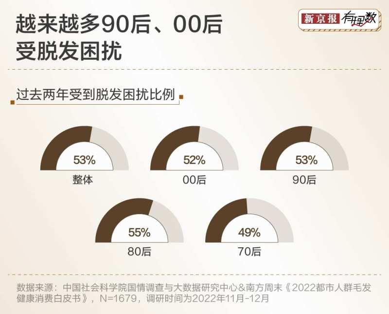 据南方周末和社科院国情调查大数据研究中心调研数据显示,在上千名受访者中有超过五成人受到脱发困扰,52%的00后已经开始担心脱发问题,49%的消费者在25岁前就开始关注自己的头皮健康问题,其中20岁前就有头皮“忧患”意识的占14%。
