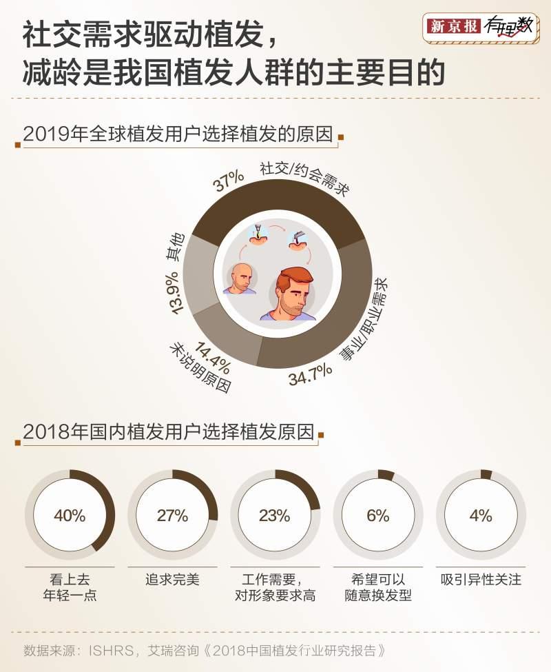 据ISHRS(国际毛发移植协会)2019年调查结果显示,70%以上的脱发患者做植发手术是出于事业、社交需求,其中出于社交需求占比略高于事业发展需求。