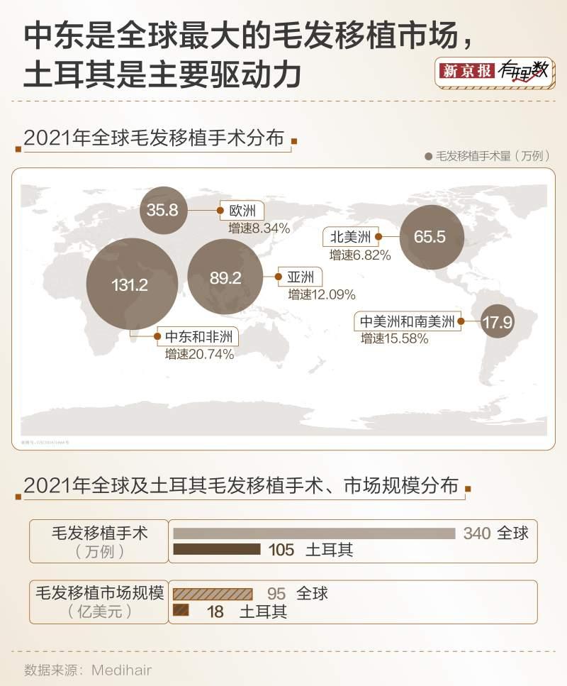 全球脱发治疗平台Medihair数据显示,2021年中东和非洲地区是全球最大的毛发移植市场,其中土耳其是其主要驱动力。2021年全球毛发移植市场份额95亿美元,仅土耳其市场就达18亿美元。