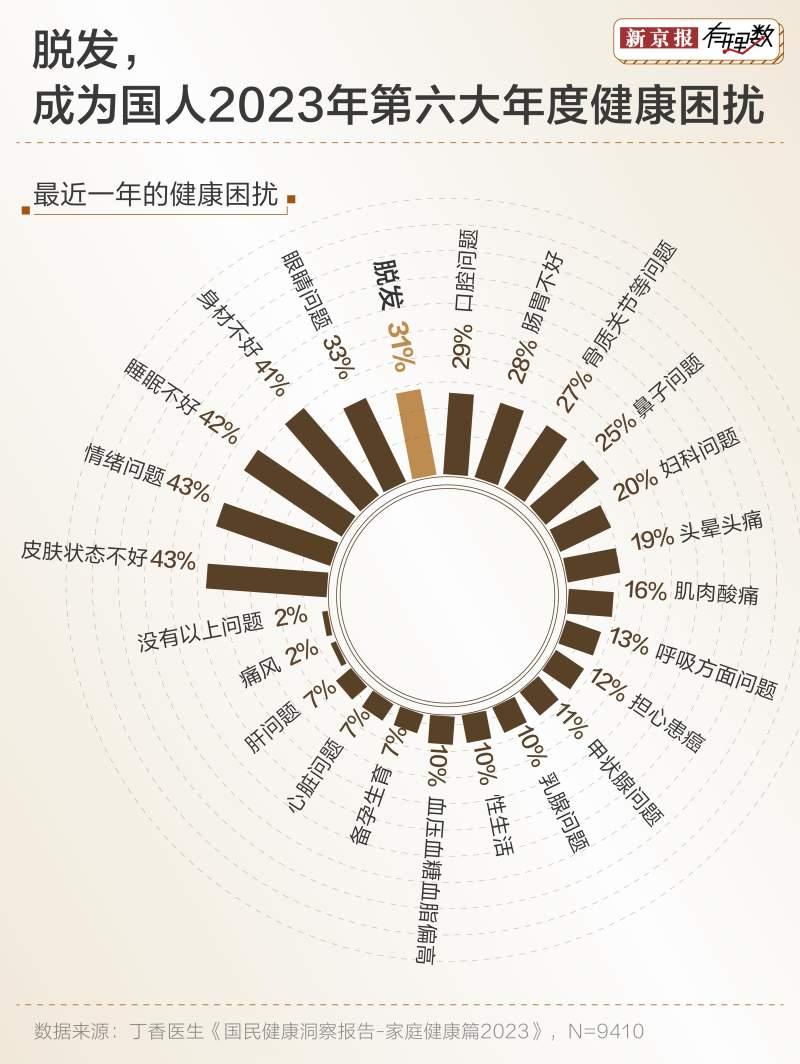 在丁香医生发起的《国民健康报告》问卷调查中,三成受访者都为脱发而苦恼,脱发成为2023年第6大年度健康困扰。比起肠胃不好和担心罹患癌症,大家更在意自己秃了没。