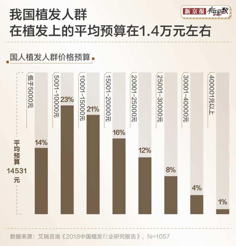 植发的费用一般根据需要种植的毛囊单位进行计算,行业调研显示,2018年我国植发人群平均花费1.8万元,功能性植发人群的花费2.1万元。但植发者的预算以1.5万元以内最多,占比近6成。从这一点来看,国内植发者的植发费用普遍超了预算。
