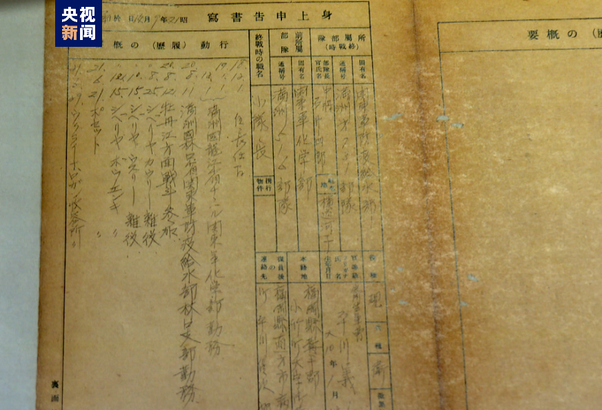 侵华日军第七三一部队罪证陈列馆研究人员 金士成:当731部队获得撤退命令的时候,他们可能在外地出差或者公出,没有在哈尔滨本部,他们已经来不及跟本部一起撤回到日本。日本海外所有部队回国之后,都要登记身上申告书,否则军籍没法被实现,没法被认可,有很多的养老金没法兑现。