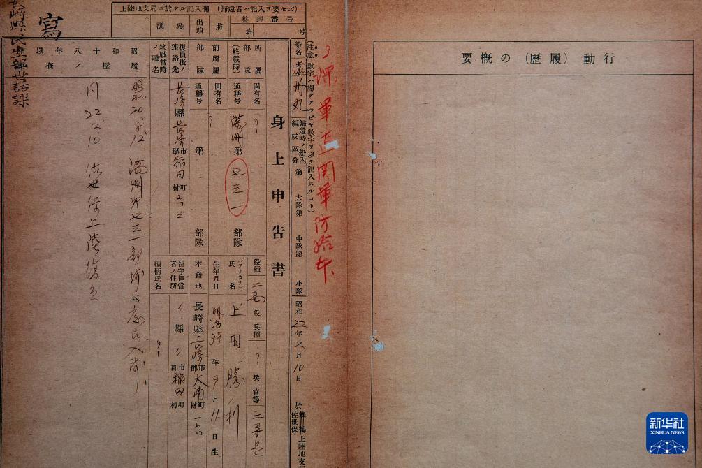 据介绍,同此前发现的731部队《留守名簿》《苏联地区未归还者部队别名簿》相比,《身上申告书》的内容更为完整。除姓名、籍贯等7类相同信息外,它还记载了战争结束时的职务名称、履历等,也就是每一份《身上申告书》都清晰记载了这名队员自入队起参与系列犯罪的情况,以及1945年8月日本败退至其回国期间的活动轨迹。
