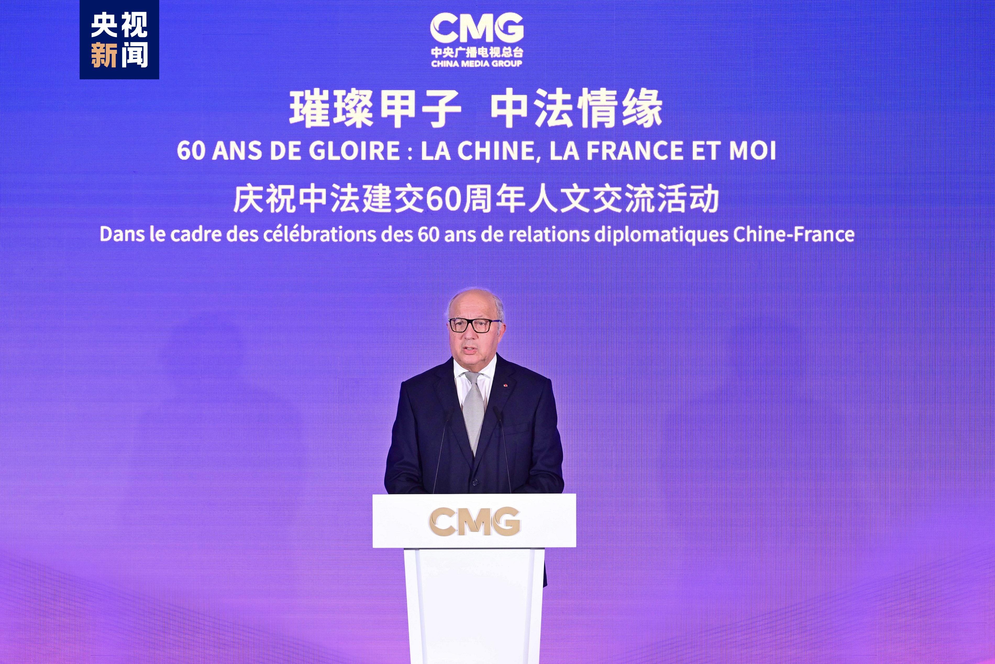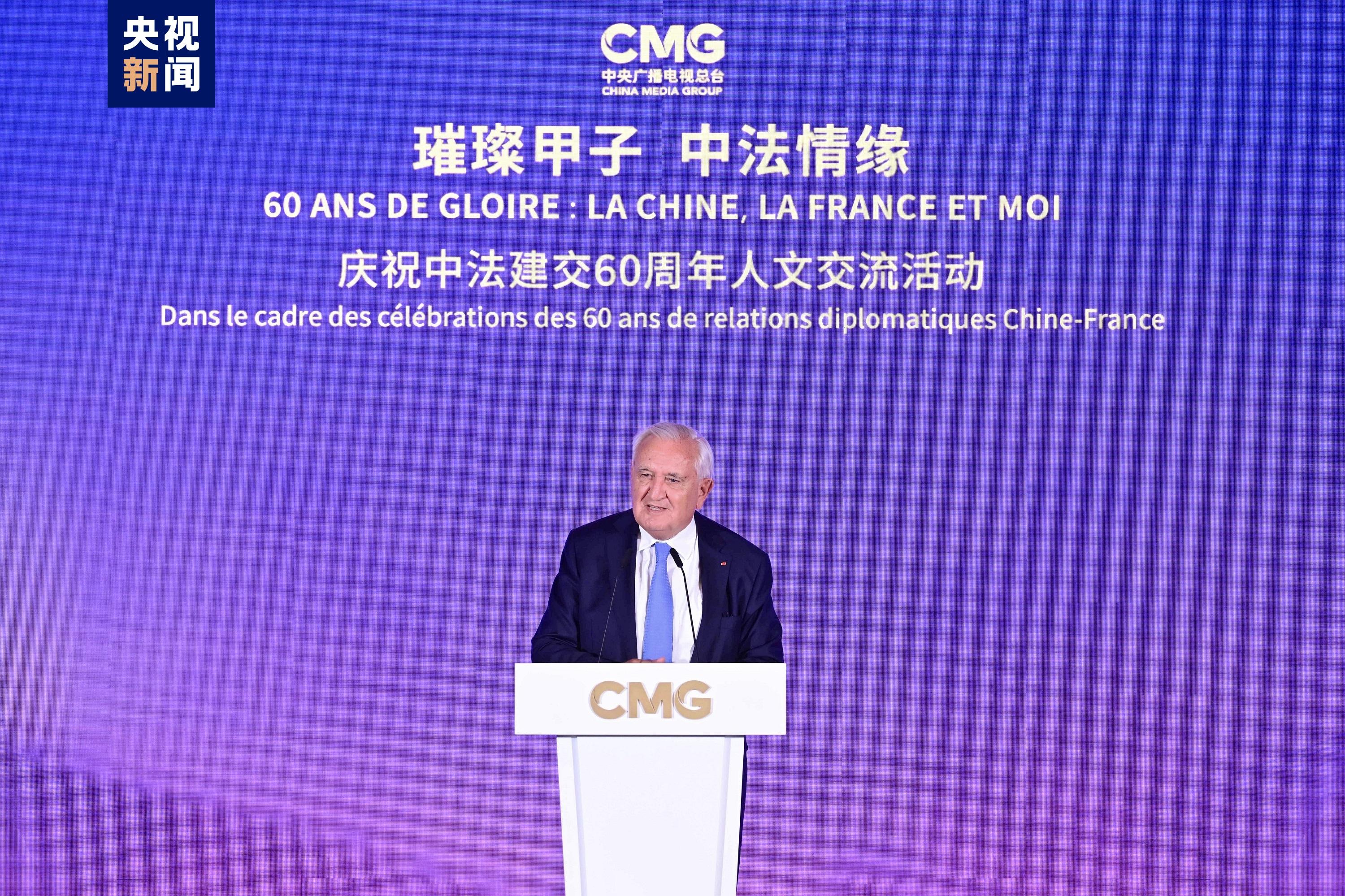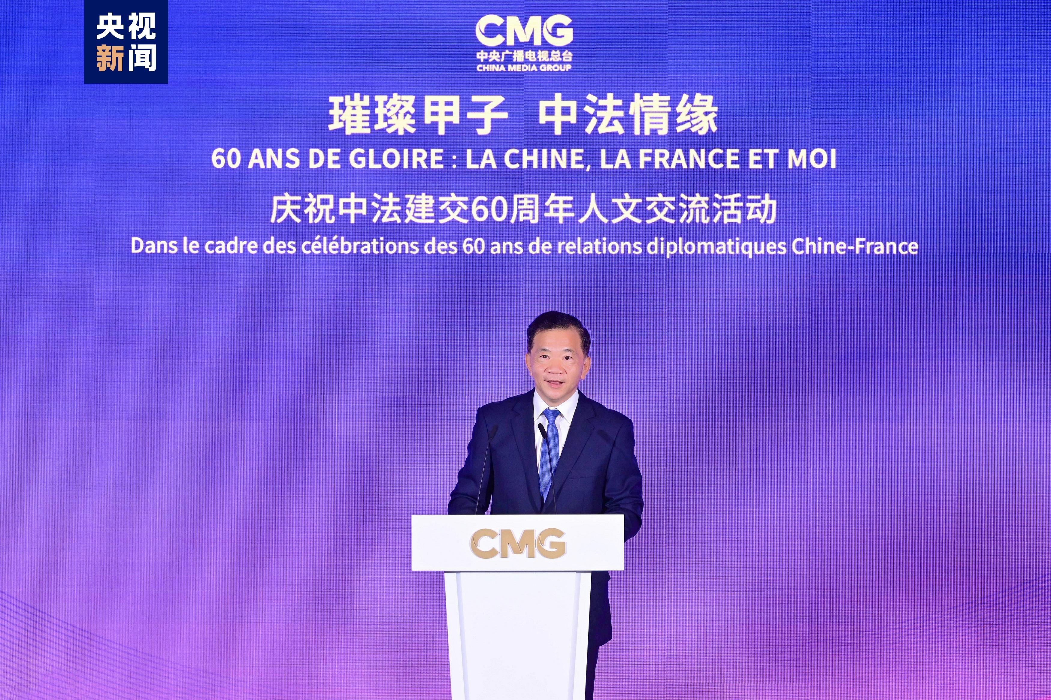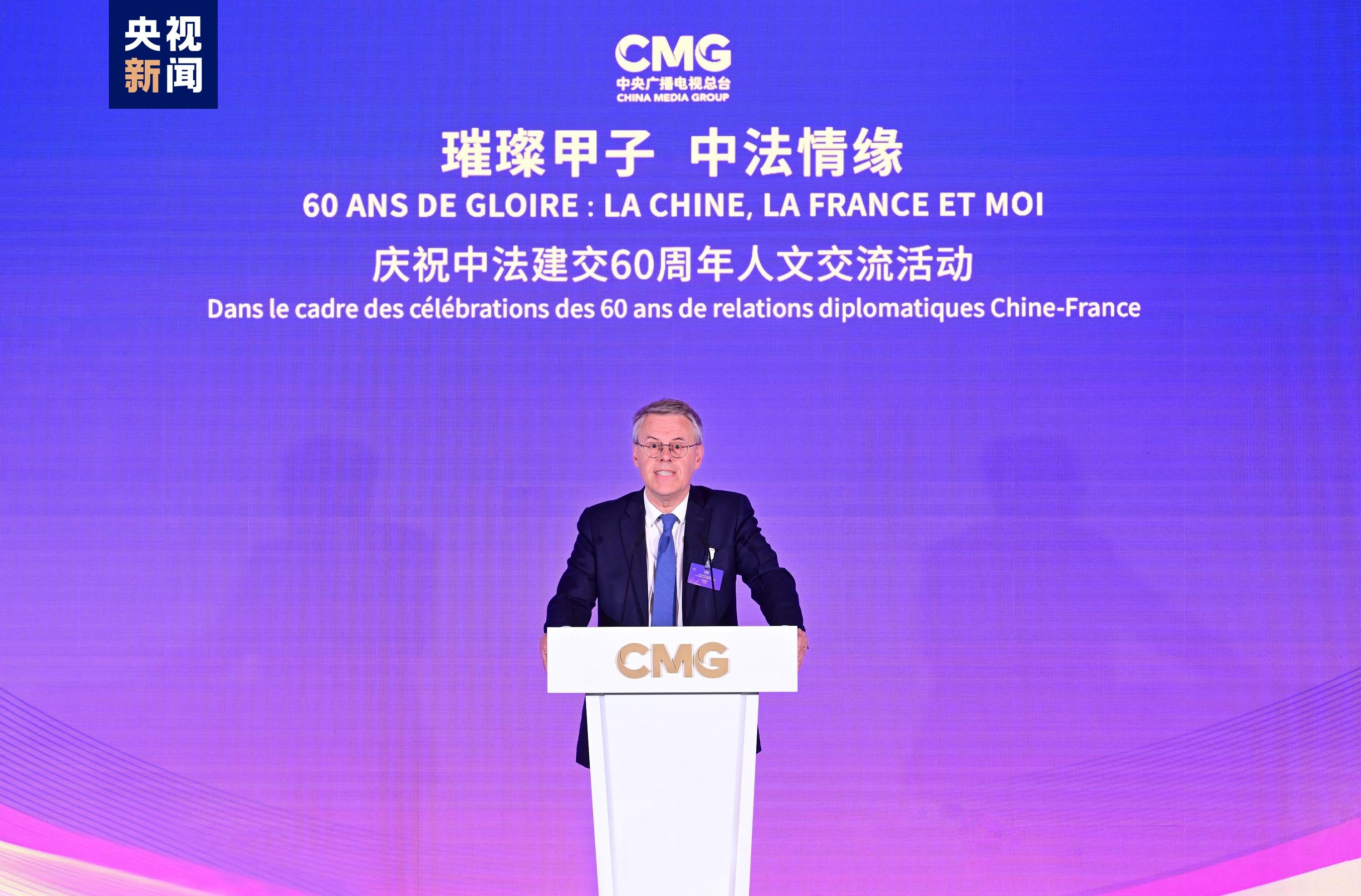 慎海雄表示,习近平主席指出,敢为人先、与时俱进是中法关系始终走在中国同西方国家关系前列的重要法宝。法国是具有独立见解、独特个性的西方大国,不仅因其经济实力,还因国家品质和人民气节,赢得了中国人民的尊重。建交60年来,中法两国的友谊之船在两国元首把舵定向下行稳致远。人文交流贵在思想、文化的交汇、碰撞和吸引。中央广播电视总台精品节目《平“语”近人——习近平喜欢的典故》(国际版)在法国播出,为大家读懂习主席的思想、中国文化、中国智慧打开一扇思想之窗,邀大家共赏璀璨辉煌的中华文明和新时代中国的独特魅力。站在中法建交一甲子的历史节点,总台愿与法国朋友们并肩同行,为打造更加牢固、更富活力的中法全面战略伙伴关系、推动构建人类命运共同体贡献智慧和力量。