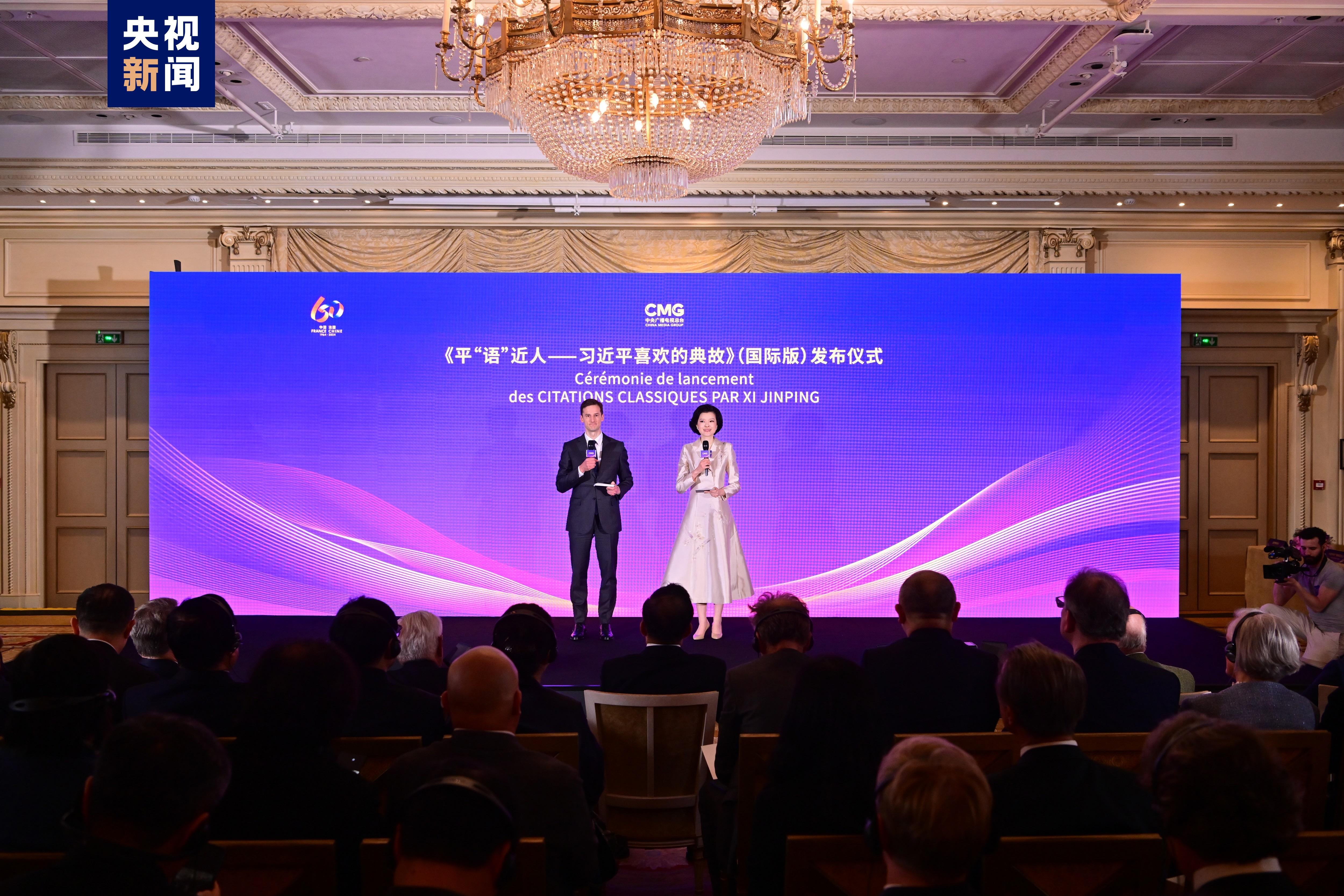 在中国国家主席习近平对法国进行国事访问期间,由中国中央广播电视总台制作的《平“语”近人——习近平喜欢的典故》(国际版)发布仪式,5月6日在巴黎举行。法国宪法委员会主席、法国前总理法比尤斯,法国前总理、法国展望与创新基金会主席拉法兰等对活动表示祝贺。节目在“每日影像”DailyMotion、欧洲新闻台等法国主流媒体上线播出。