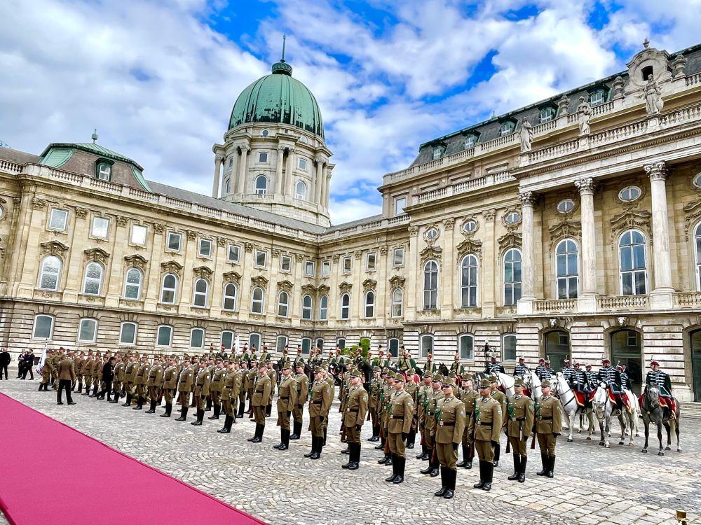 初夏时节的布达佩斯阳光明媚,古老宏伟的布达王宫庄严矗立,中匈两国国旗相映成辉。习近平和夫人彭丽媛乘坐的国宾车队在匈牙利礼宾马队护卫下缓缓驶入布达王宫内庭。舒尤克总统夫妇和欧尔班总理夫妇热情迎接。