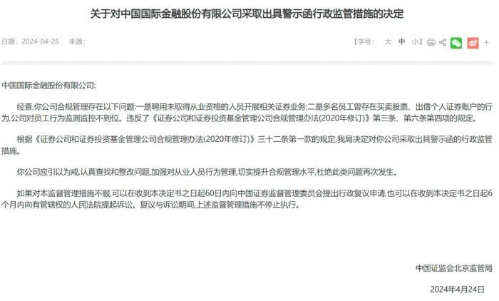 4月26日,中金公司因合规管理存在以下问题:一是聘用未取得从业资格的人员开展相关证券业务;二是多名员工曾存在买卖股票、出借个人证券账户的行为,公司对员工行为监测监控不到位。中国证监会北京监管局决定对中金公司采取出具警示函的行政监管措施。