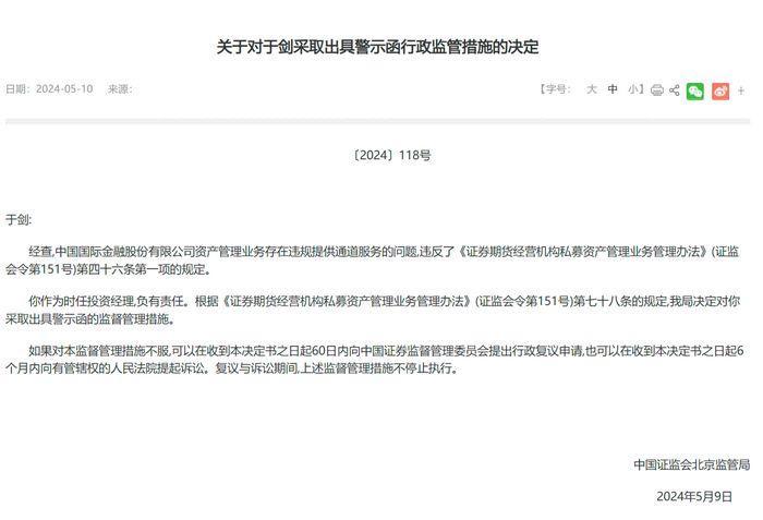同日,因中金公司资产管理业务存在违规提供通道服务的问题,中金公司时任分管业务高管徐翌成及投资经理于剑被中国证监会北京监管局出具警示函。