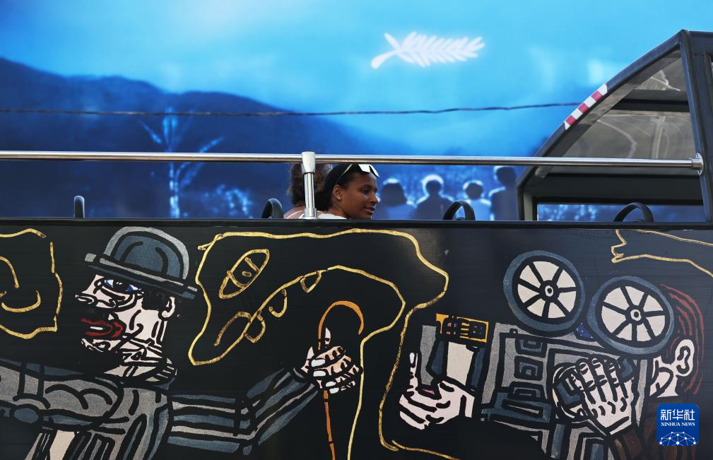 5月13日,在法国南部小城戛纳,一辆旅游大巴经过电影宫前的巨幅海报。