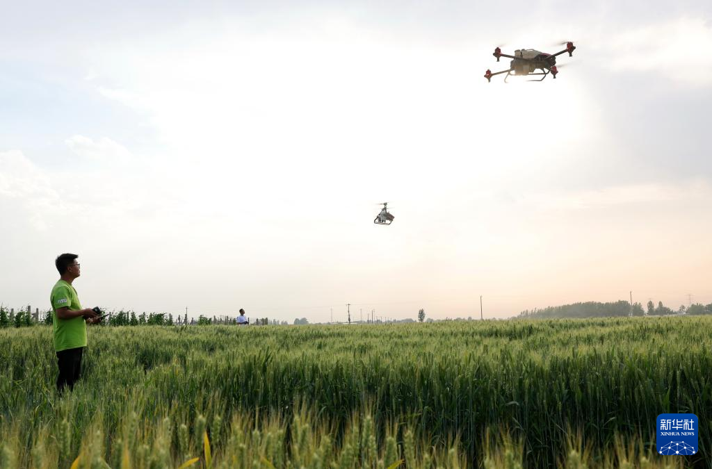 5月16日,河北省晋州市槐树镇北白水村的农民在麦田内使用无人机进行“一喷三防”作业。