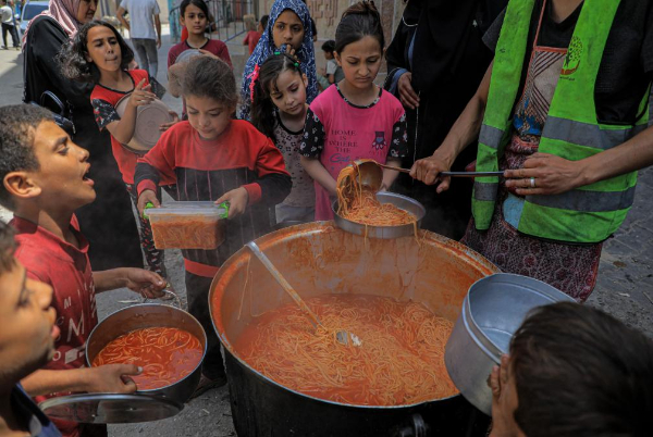4月28日,在加沙地带南部城市拉法,巴勒斯坦儿童领取食物。新华社发(里泽克·阿卜杜勒贾瓦德摄)