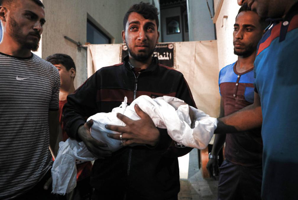5月7日,在加沙地带南部城市拉法的一家医院,一名男子抱着在以色列空袭中丧生的儿童。新华社发(里泽克·阿卜杜勒贾瓦德摄)