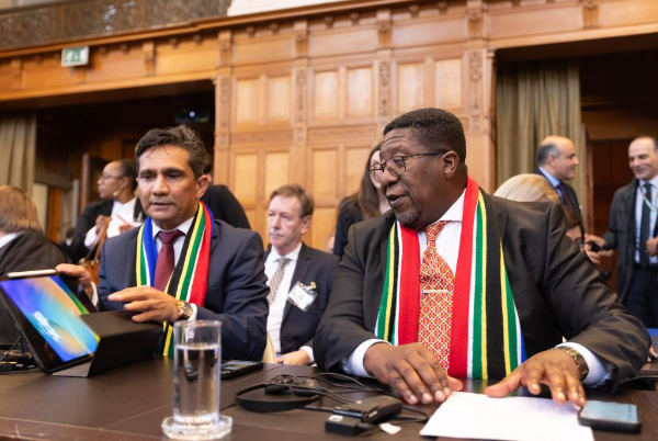 5月16日,在荷兰海牙,南非驻荷兰大使武西穆齐·马东塞拉(前右)出席国际法院听证会。新华社发(西尔维娅·莱德雷尔摄)