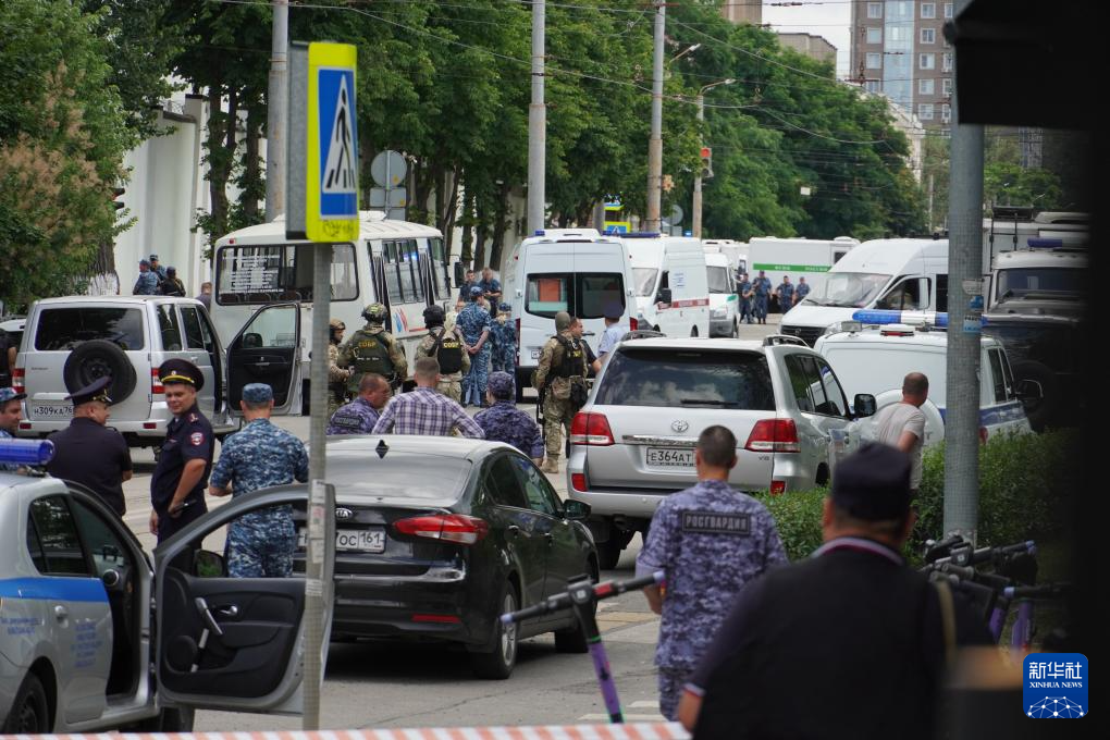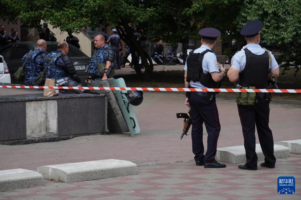 6月16日,在俄罗斯顿河畔罗斯托夫,警察在案发现场附近警戒。新华社发(弗拉基米尔摄)