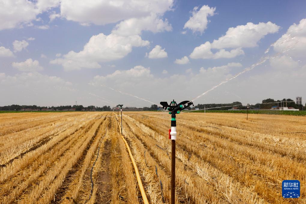 6月24日,在山东省东营市广饶县李鹊镇西张庄村的田地里,农民使用节水喷淋设施浇地造墒。