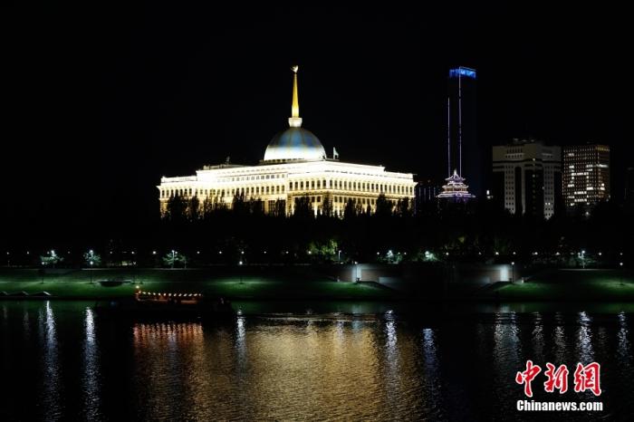 资料图为7月1日傍晚阿斯塔纳伊希姆河畔的总统府。