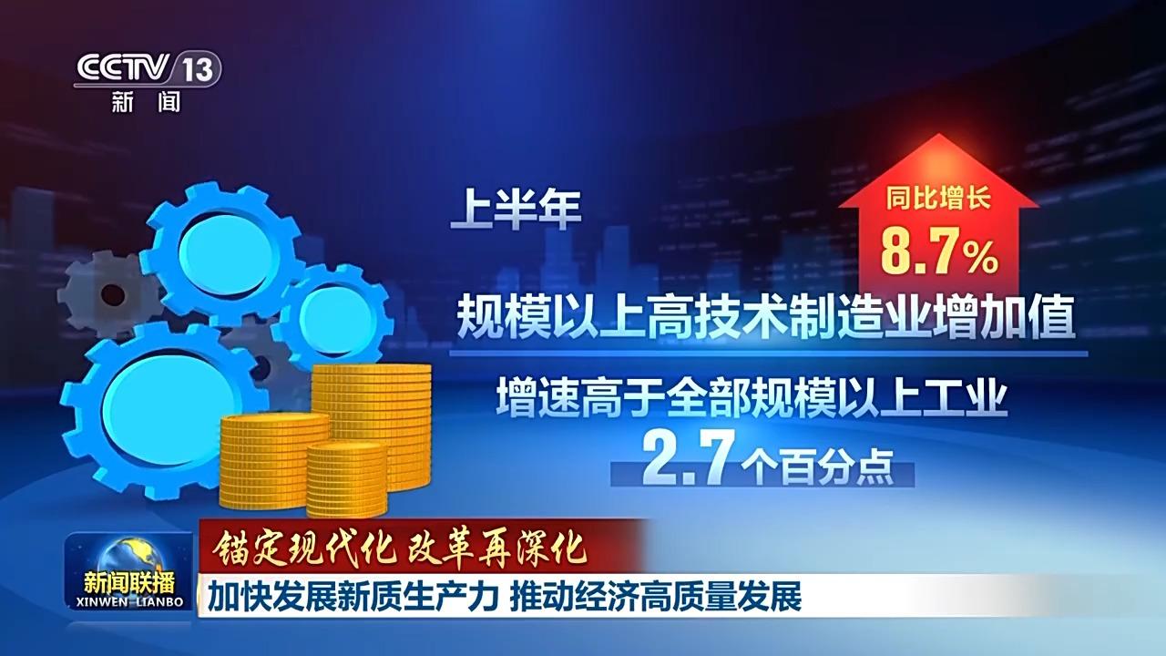 上半年,规模以上高技术制造业增加值同比增长8.7%,增速高于全部规模以上工业2.7个百分点。服务机器人、新能源汽车、太阳能电池等智能绿色产品产量均保持两位数增长。新型消费不断拓展,“新三样”、跨境电商等外贸新动能加快培育。高质量发展取得新成效。