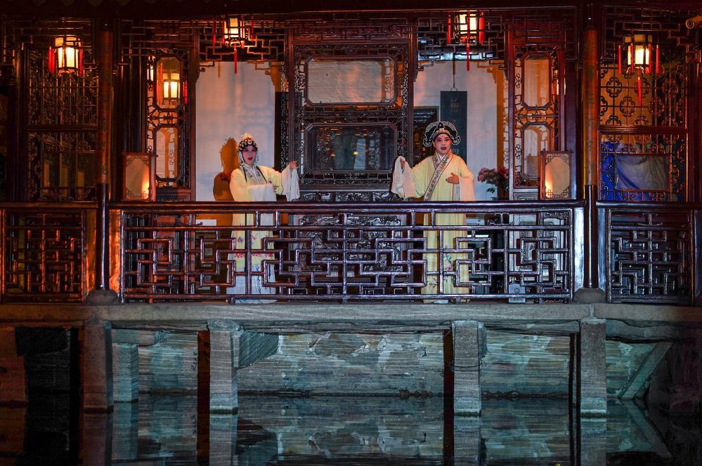入夜时分,游人们踏着青砖石板,清丽婉约的歌声自河上飘来……沧浪亭里演出实景版昆曲《浮生六记》,世界文化遗产与世界非物质文化遗产联袂,令人入迷。