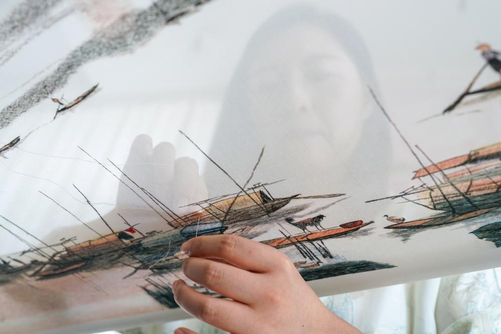 在苏绣小镇体验馆内,工作人员在进行苏绣技艺展示。新华社记者 李博 摄