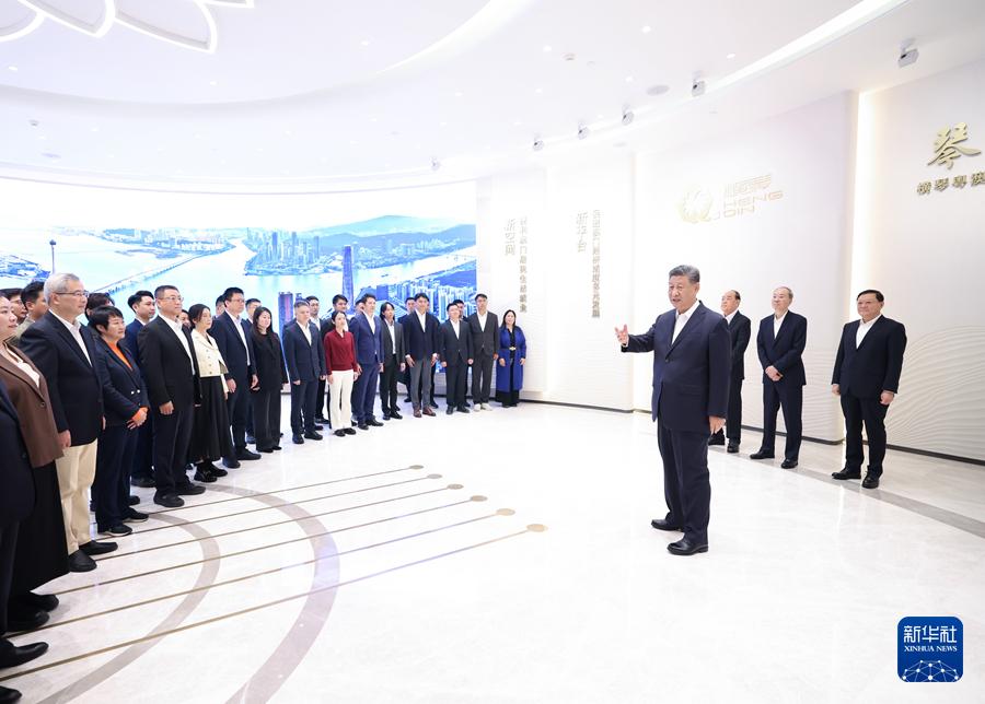 12月19日上午,中共中央总书记、国家主席、中央军委主席习近平在澳门特别行政区行政长官贺一诚陪同下,来到横琴粤澳深度合作区考察。这是习近平在横琴天沐琴台展示厅考察时,同参与横琴粤澳深度合作区规划、建设、管理、服务等各方面代表亲切交流。