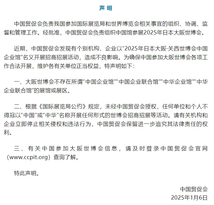 近期,中国贸促会发现有个别机构、企业以“2025年日本大阪·关西世博会中国企业馆”名义开展招商招展活动,造成不良影响。为确保中国参加大阪世博会各项工作合法开展,维护各有关单位正当权益,特声明如下: