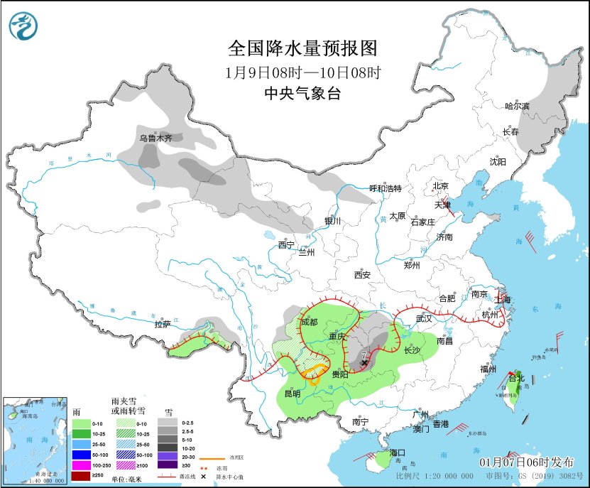 1月9日08时至10日08时,内蒙古西部、东北地区东部、山东半岛东北部、新疆南疆北部和北疆大部、西藏东南部、甘肃河西大部、川西高原东部、四川南部、湖北西南部、湖南西部、重庆东南部、贵州西部和东部、云南东北部等地部分地区有小到中雪或雨夹雪,其中贵州东部局地大雪(5~7毫米)。贵州西部部分地区有冻雨。西藏东南部、四川东部、重庆中南部、湖南中西部、贵州、云南东部、广西北部、海南岛中东部、台湾岛大部等地部分地区有小雨,其中,台湾岛东部部分地区有中雨(见图3)。