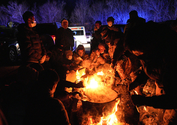 凌晨4时,刺骨的寒风,吹动蒸汽四处飘散。在措果乡政府旁的一处帐篷,来自甘肃的马俊云和同伴们用大锅煮面,免费提供给过往的人们。