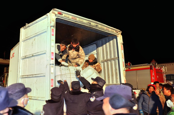 1月7日,救灾人员在定日县措果乡装运救灾物资。新华社记者 姜帆 摄