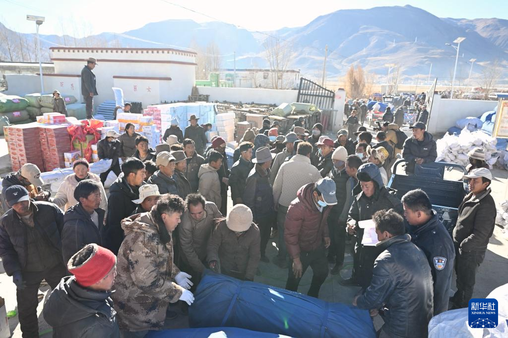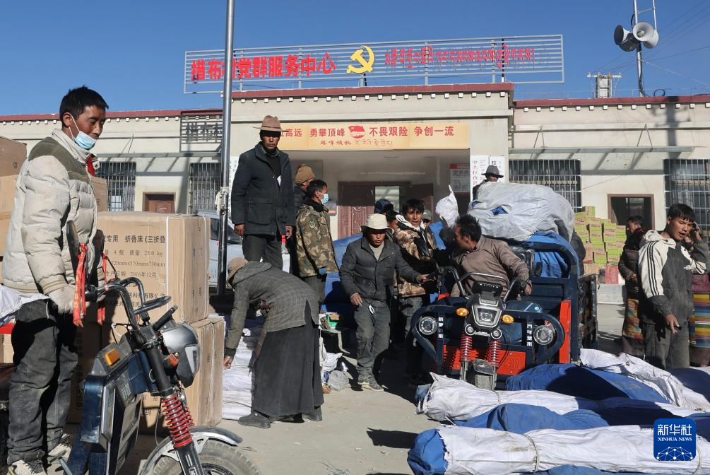 1月9日,受灾群众在措布村村委会领取帐篷等救灾物资。