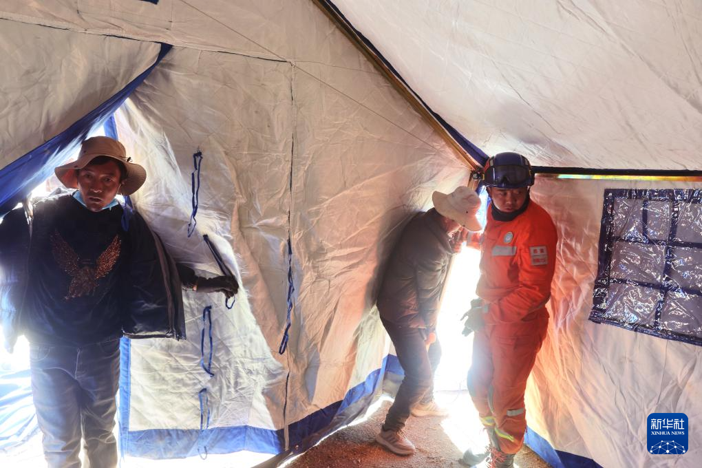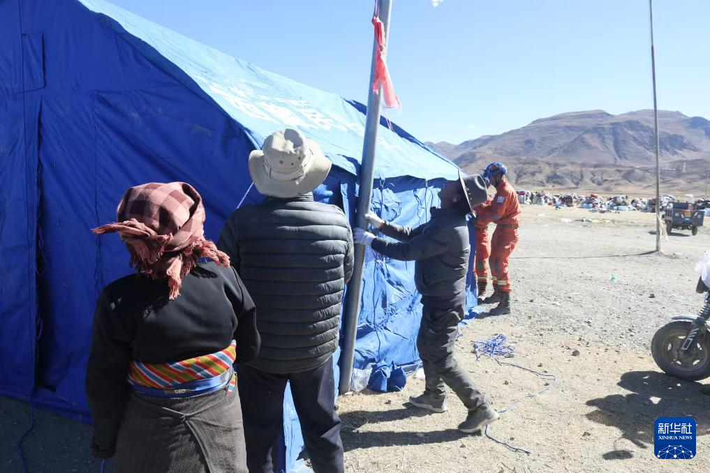 1月9日,村干部和救援人员在措布村帮助受灾群众搭建帐篷。