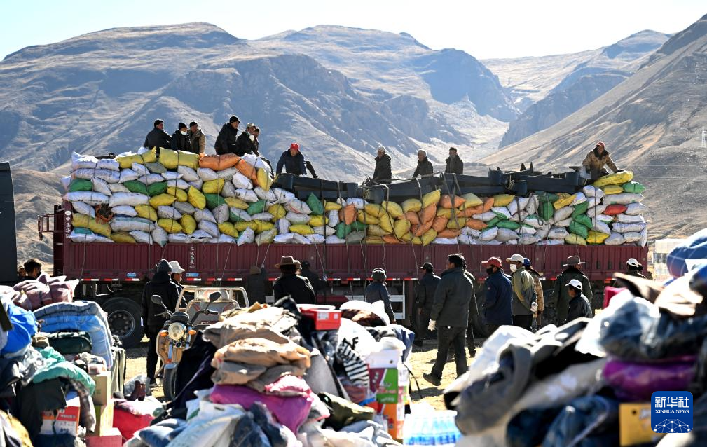 1月9日,受灾群众在措布村村委会领取救灾物资。