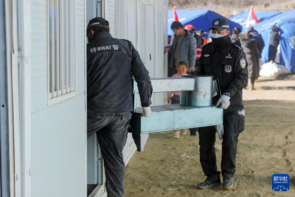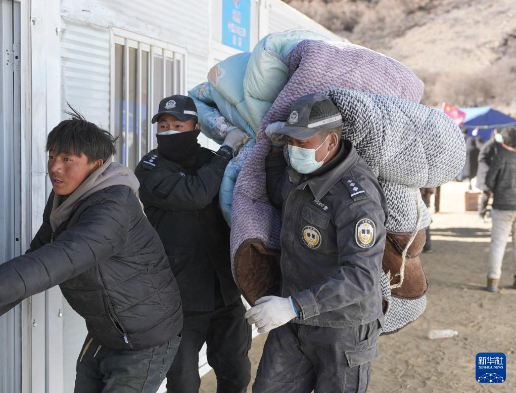 1月10日,在定日县长所乡古荣村,警察帮助受灾群众将物品从帐篷搬至板房。新华社记者 晋美多吉 摄