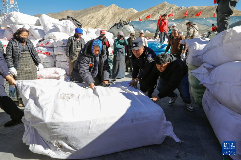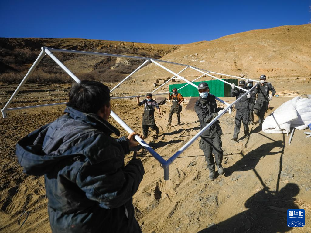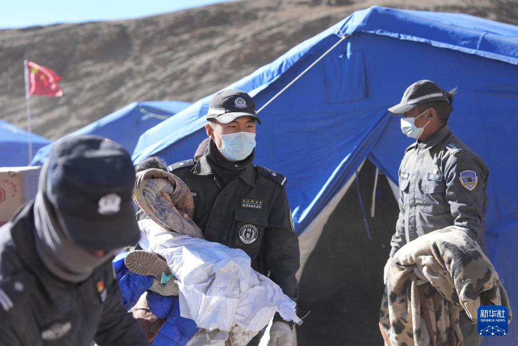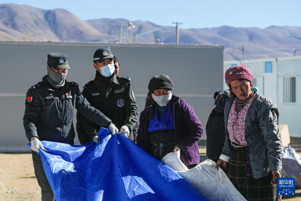 1月10日,在定日县长所乡古荣村,警察帮助搬入板房的受灾群众收帐篷。新华社记者 沈伯韩 摄