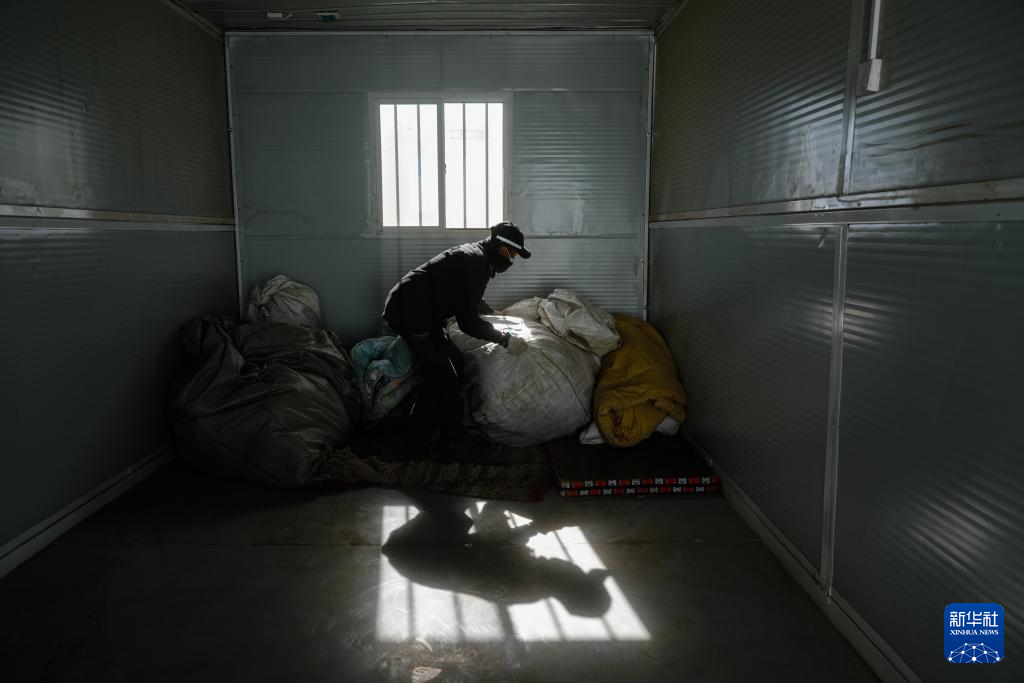 1月10日,在定日县长所乡古荣村,一名警察将受灾群众的物品从帐篷搬进板房。新华社记者 沈伯韩 摄