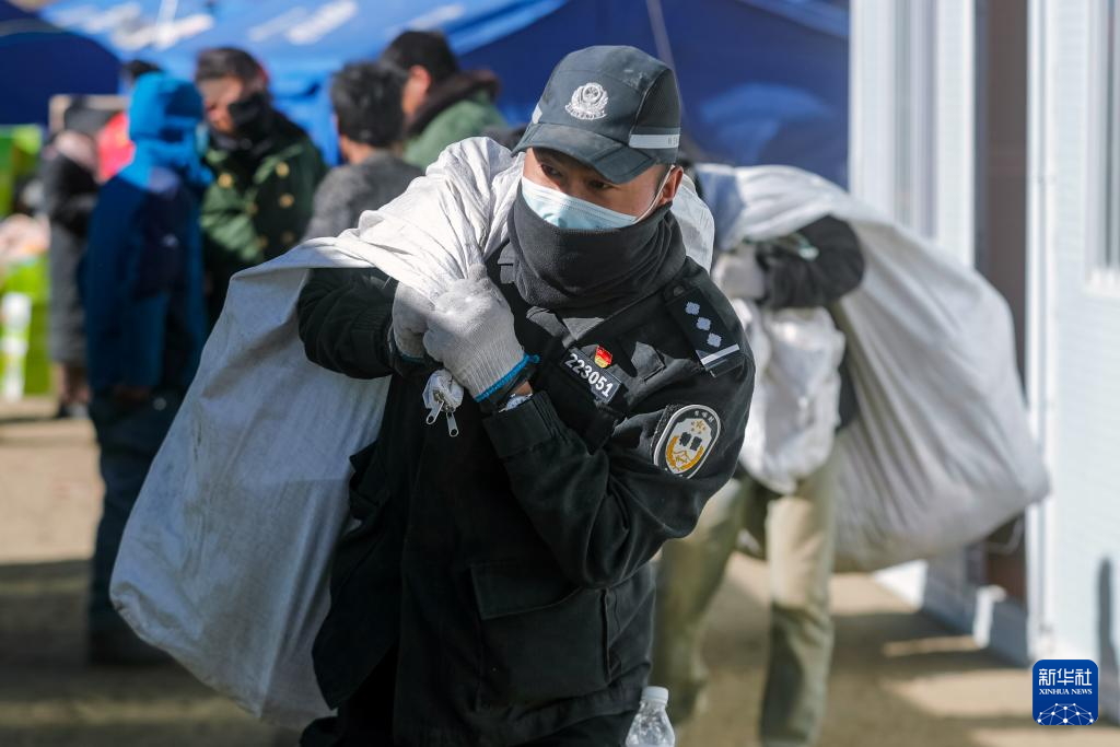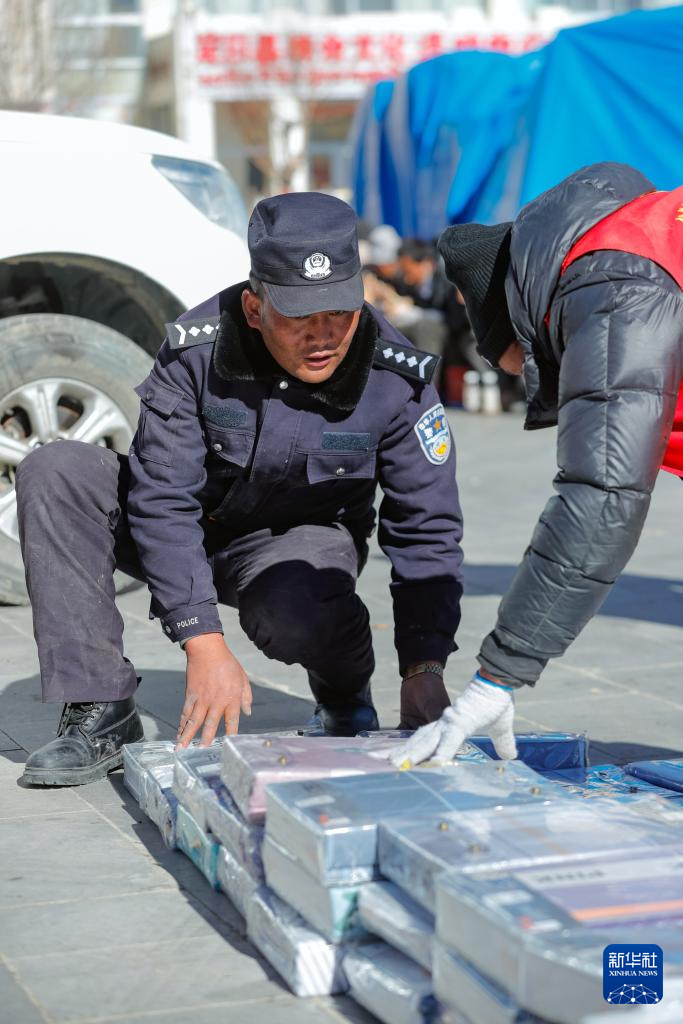 1月10日,在定日县民族团结广场,一名警察搬运将要运往受灾群众安置点的物资。新华社记者 沈伯韩 摄