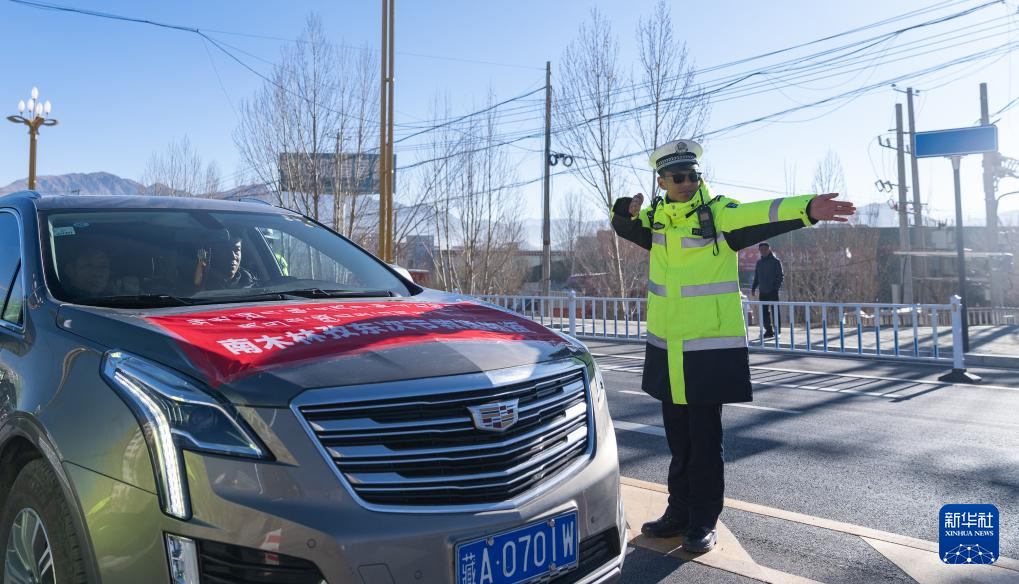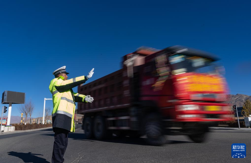 1月10日,在日喀则市区,交警加措在指挥交通,让完成救灾物资运输任务的救援车辆顺利出城。新华社记者 丁增尼达 摄