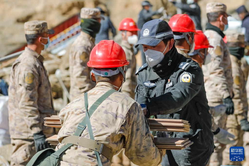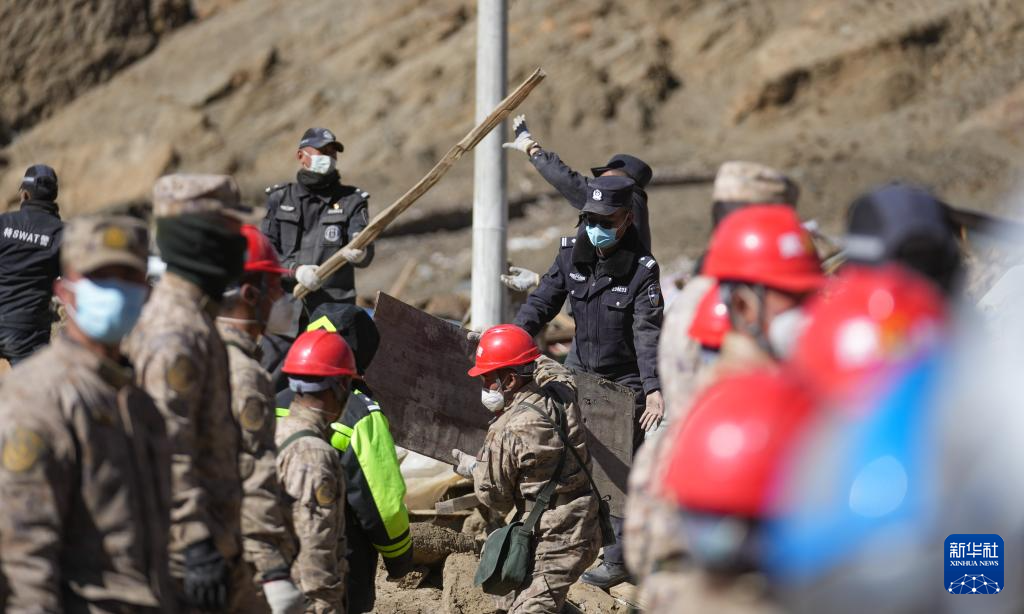 1月10日,在定日县长所乡古荣村,警察和各方救援力量一起清理废墟。新华社记者 晋美多吉 摄