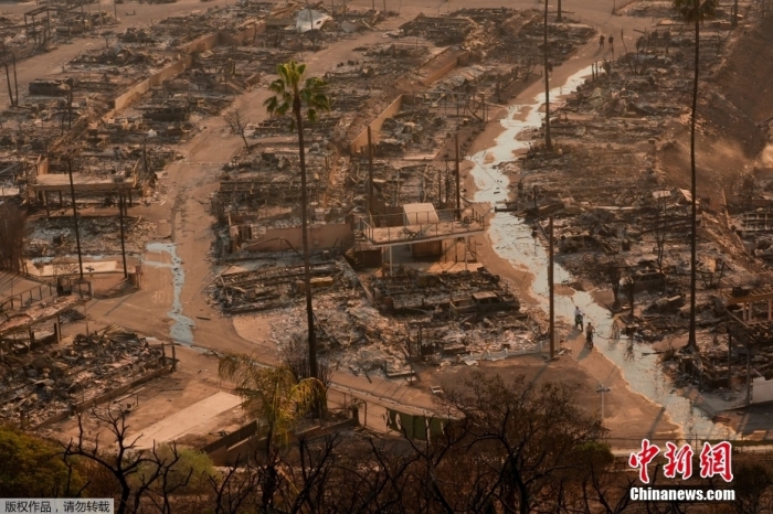 图为当地时间1月9日,美国加州洛杉矶一社区,山火过后土地一片废墟。