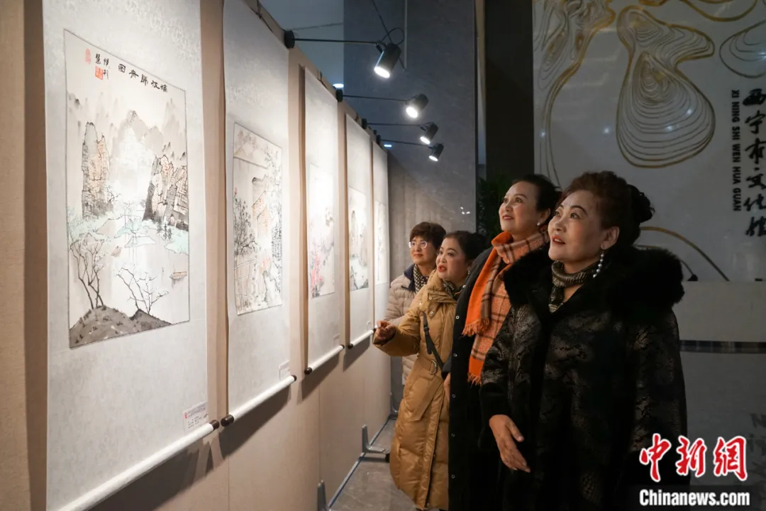 2024年12月13日,2024年西宁市老年艺术学校秋季免费培训班汇报展演在西宁市文化馆举办。图为市民参观国画班学员作品。中新社记者 马铭言 摄