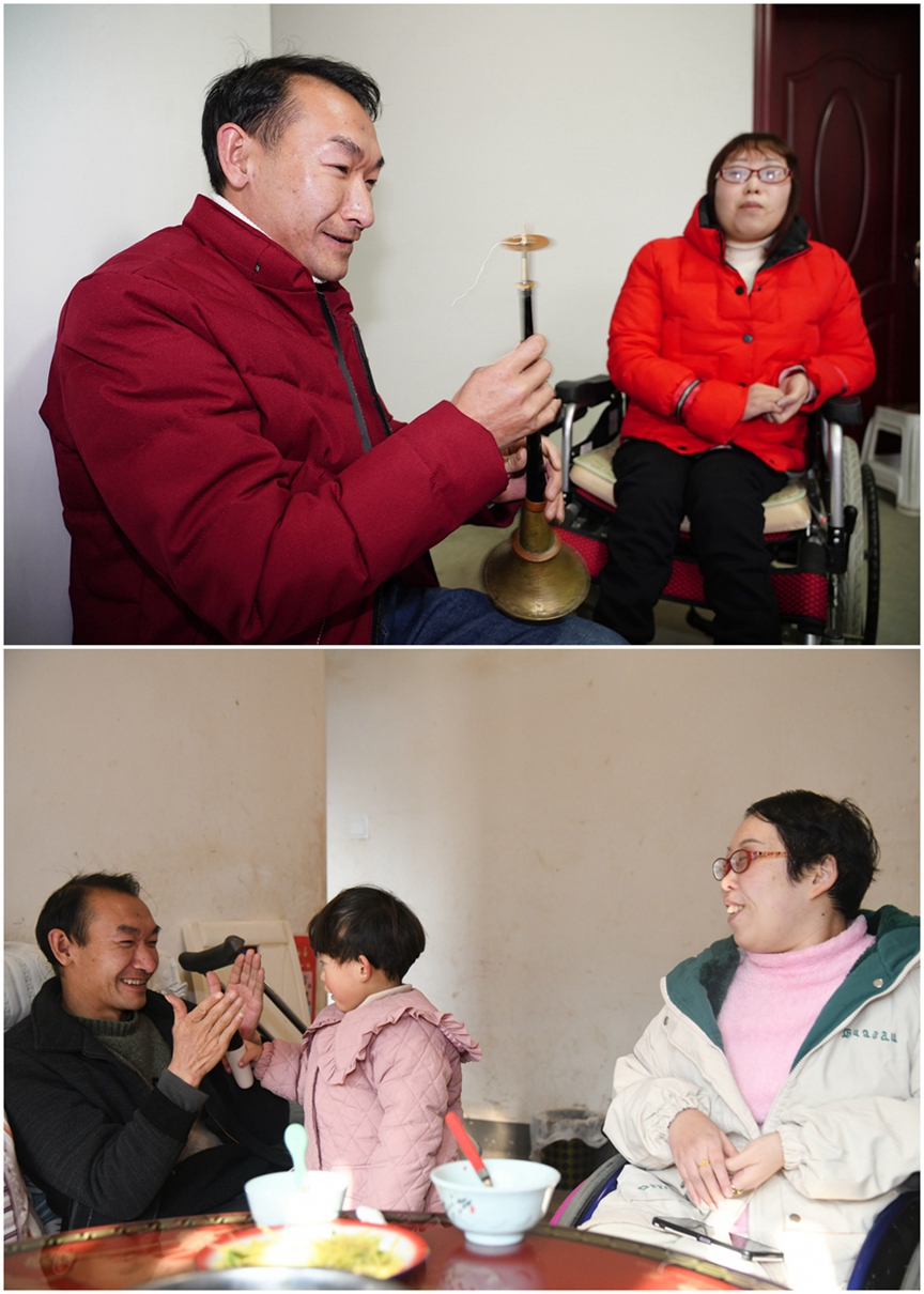 这是一张拼版照片。上图为:2019年1月6日,牟文贵(左)在家为妻子吹奏唢呐(新华社记者 邵瑞 摄);下图为:2024年12月29日,牟文贵(左一)在家与女儿玩耍(新华社记者 张博文 摄)。